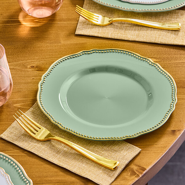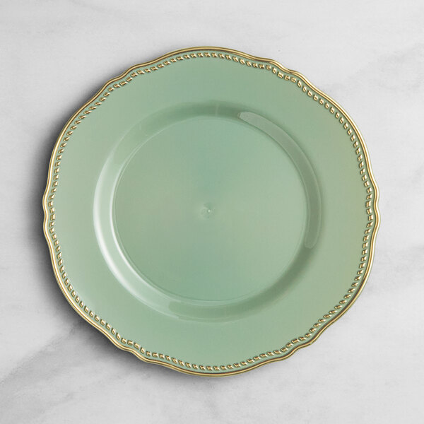 Add a touch of sophistication to your catered event with this Visions Heirloom 9" eucalyptus round plastic plate with gold vintage rim.