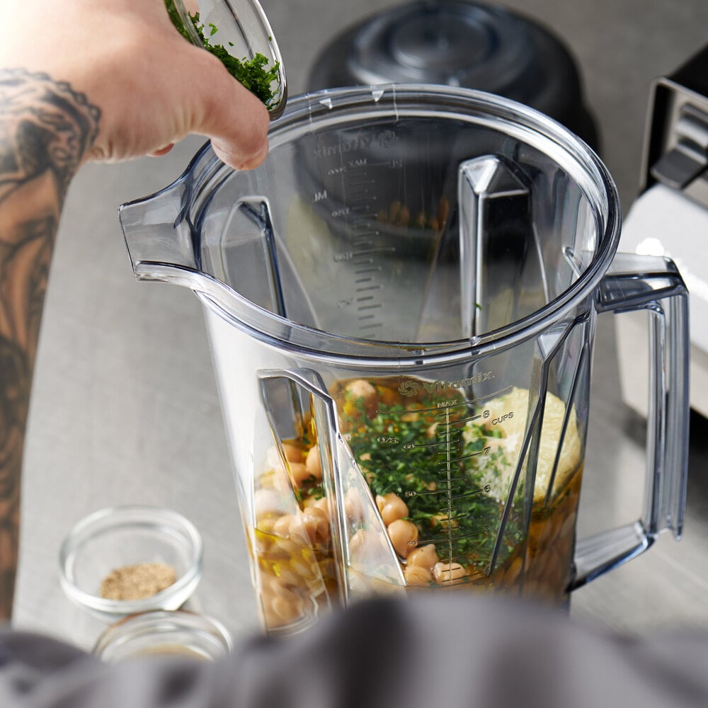 This particular commercial blender comes standard with a 64 oz. high-impact container, which is clear for easy product monitoring. It's also embossed with graduations for effortless measuring. A side handle makes it simple to pick up, pour, and generally maneuver.