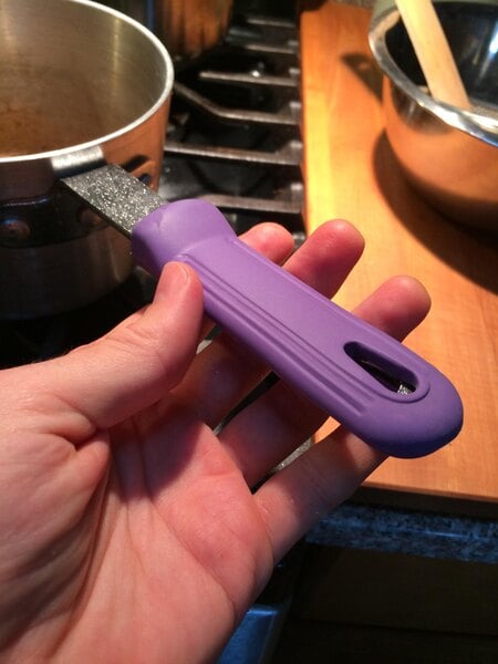 This sleeve slides easily onto pan handles when warmed through a dish washing cycle, and as it cools, tightens firmly around the handle. It is made of durable yet flexible silicone material for long lasting use and comfort. Plus, the purple color of the sleeve can be used to create a color coded system in your kitchen for quick identification of pans used for allergen-free cooking. When it comes time to wash the sleeve, easily slide it off for quick and simple cleaning.