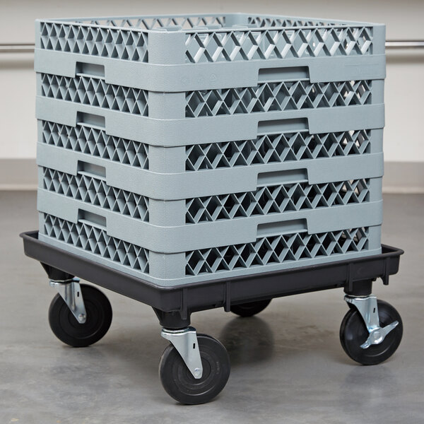 This dolly base will hold loads up to 350 lb., helping you transport stacks of heavy dish racks or glass racks with ease! The Vollrath black rack dolly base comes equipped with a 1/2" hole for drainage.
