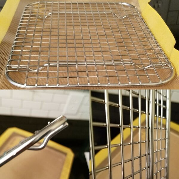 It can be hard to remove stubborn, baked-on food particles, so save yourself time and effort in the cleaning process by cooking smarter, with this 11 1/8" x 8 13/16" cooling rack! This 1/2 size rack can be used to elevate food off of a half size sheet pan so that you have less to clean up, or you can use it to cool baked goods on a countertop. Its all stainless steel construction ensures years of heavy use while minimizing damaging rust.