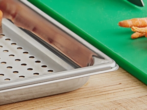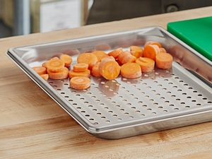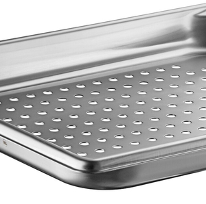 This perforated pan is made of 22 gauge, 300 series stainless steel for durability.The pan's 1/4" holes on the bottom allow food to drain quickly, making this pan perfect for steaming or draining.
