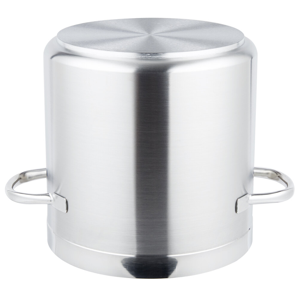 This stock pot features a 1/4" thick aluminum clad bottom for quick, even heat distribution. A thin bottom wafer of stainless steel provides increased durability and makes this stock pot induction ready!
