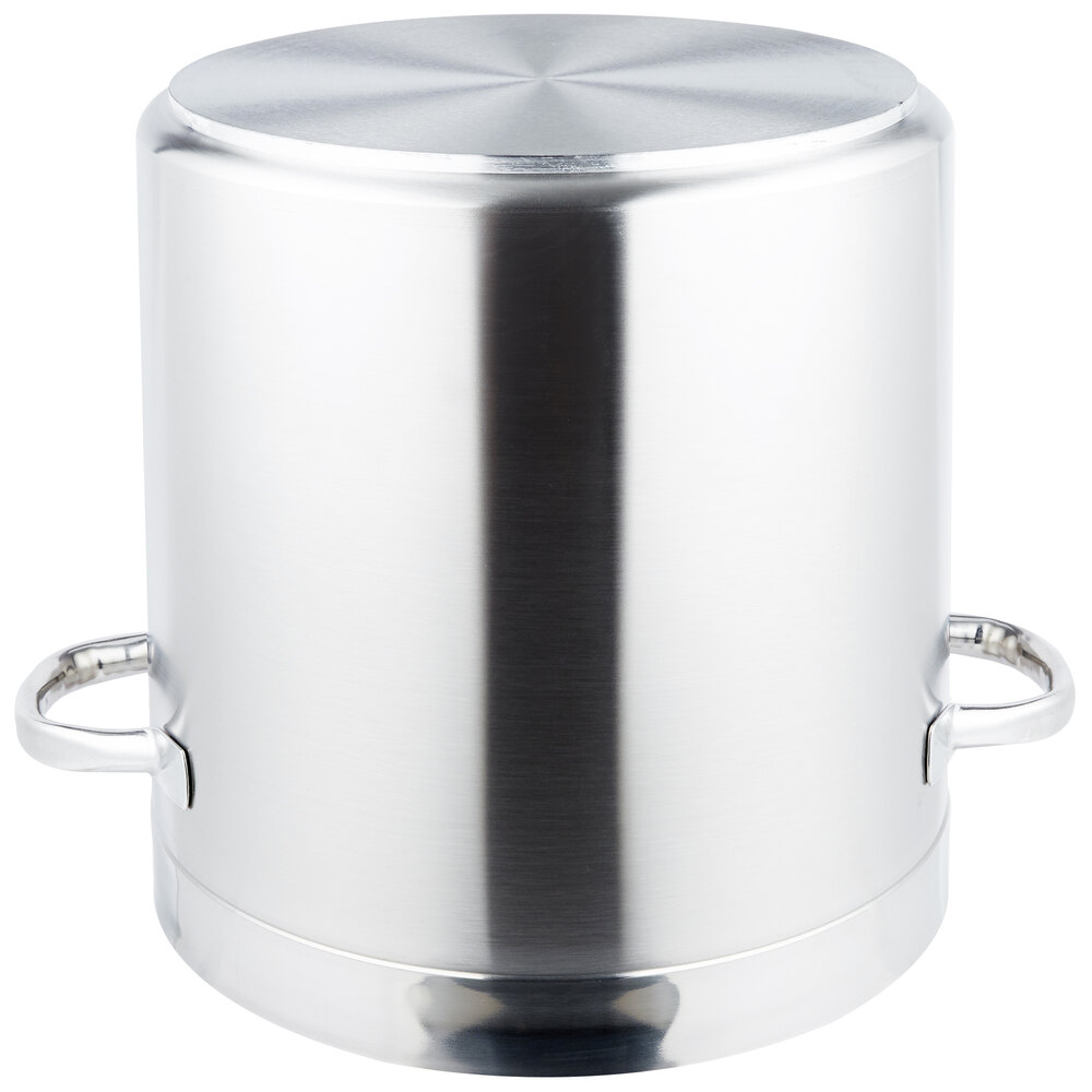 Thanks to its tall sides and wide base, this Vollrath 3109 Centurion 38 qt. stock pot is ideal for preparing soups, pasta, large vegetables, and steaming or boiling lobster! This pot's tall, narrow profile is designed to help preserve liquids longer and force them to bubble up through the ingredients in the pot, maximizing flavor transfer.