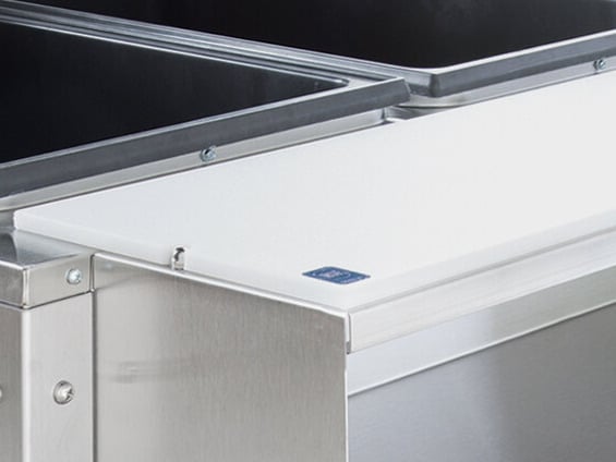 The 8" wide polyethylene cutting board provides a convenient preparation surface. It is 3/8" thick.