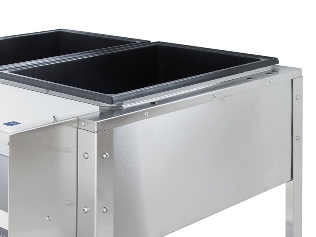 Sealed well tables do not need spillage pans; water is added directly to the well, and is emptied through a drain after service. However, sealed well tables should not be used for dry heat holding.