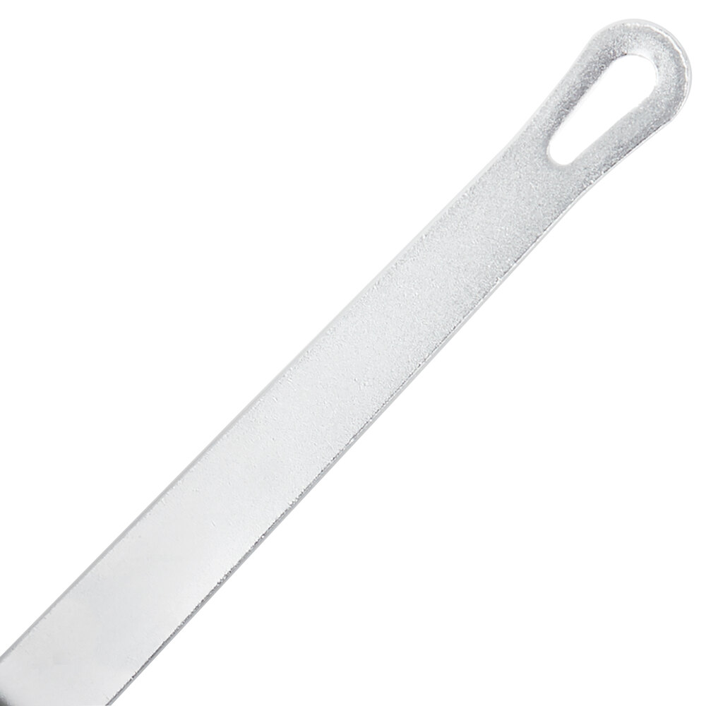 The traditional plated handle sits elevated above the pan, which allows the user to comfortably move or adjust the pan as needed. It also includes a hanger loop for convenient storage.