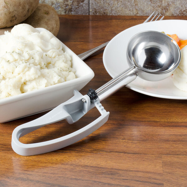 Love this scoop. The ergonomics of it are very nice because after a short while with the previous one we used my hand would start cramping. This gives a nice even portion which is great when serving a large party and you want all the plates to have the same visual and proportions.