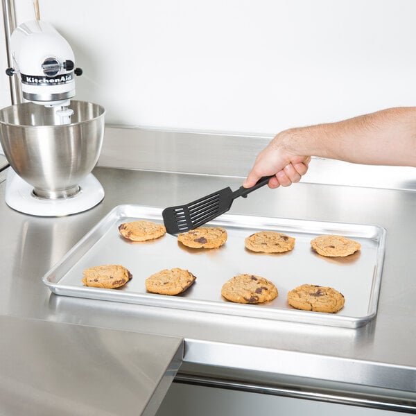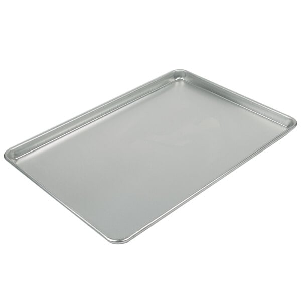 Thanks to its smooth, natural surface and inverted, tapered design, this aluminum bun / sheet pan is easy to clean after each use. Plus, its curled edges prevent products from sliding off and makes it easy to hold when transporting baked items from the oven to a cooling rack.
