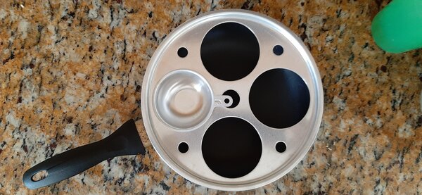 It is lightweight egg poacher insert, can fit on any 8 inches pan. I has four holes to make four eggs at a time. It is perfect for family breakfast, make egg poaching easier and perfect. Very happy with the purchase.