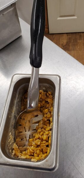 The spoon has a sturdy handle and the curved edge can collect larger pieces without a problem. Because it has a classic style it can be used on a serving line.