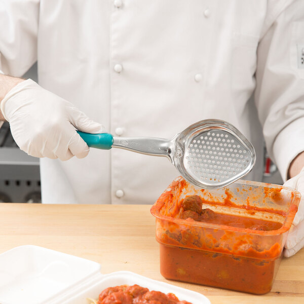 Control portions and maximize profits with this Vollrath Jacob's Pride® 6422655 6 oz. teal perforated oval Spoodle®! Perfect for creating consistent serving sizes and dishing up just the right amount of dips, vegetables, sauces, gravies, and more, this kitchen staple combines the convenience of a serving spoon and the accuracy and consistency of a ladle. Practically designed, this Spoodle® features a built-in stopper notch to prevent the handle from sliding into food pans, and a textured, ergonomic handle to reduce hand fatigue. The oval scoop is designed to reach food pan corners, ultimately reducing waste and increasing the number of servings per pan!