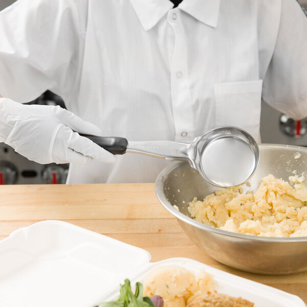 Control portions and maximize profits with this Vollrath Jacob's Pride® 6433420 Spoodle®! Perfect for creating consistent serving sizes and dishing up just the right amount of dips, dressings, sauces, gravies, and more, this kitchen staple combines the convenience of a serving spoon and the accuracy and consistency of a ladle. Practically designed, this Spoodle® features a built-in stopper notch to prevent the handle from sliding into food pans, and a textured, ergonomic handle to reduce hand fatigue.