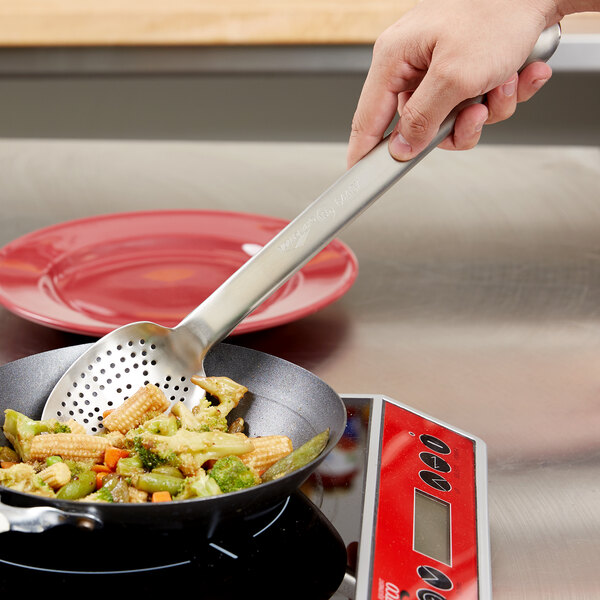 Serve, mix, and baste with this Vollrath 64407 Jacob's Pride® 15", heavy-duty one-piece perforated stainless steel spoon! Made of stainless steel, this spoon boasts a one-piece construction for a durable, sanitary addition to your kitchen tools. Featuring a patented rolled handle, this spoon is designed to provide unrivaled strength and comfort. With its perforated design, this spoon is ideal for scooping out chicken or vegetables from oil or sauce to drain any excess liquid back into the pan.