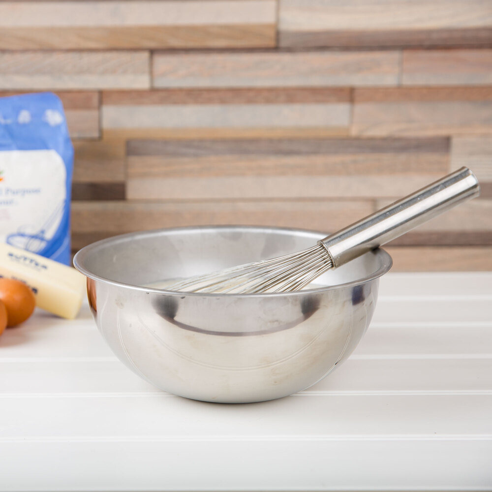 Strong enough for any mixing job, this durable stainless steel mixing bowl is sure to become a staple in your commercial food prep area. It's perfect for preparing a variety of foods, from brining pork to individual ingredient whisking! It features a weighted, concave bottom to ensure that the bowl stays stable when in use. Wash and reuse it time and again without the worry of warping or denting.