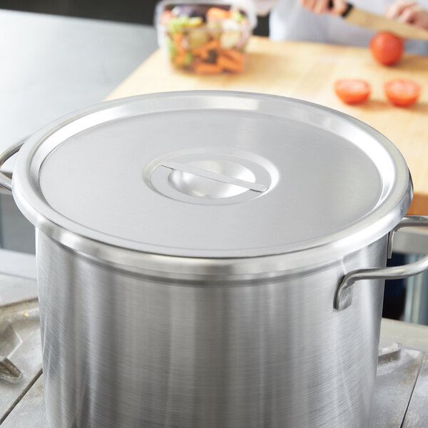 This lid works great with my 10 qt vollrath stock pot. It cleans up easily no matter what sticks or dries on it. It fits well and the handle is easy to grab no matter how fast you're working. I've had mine for a few years now and it still looks great, no warping or staining etc. which is surprising considering the abuse it endures from daily use.