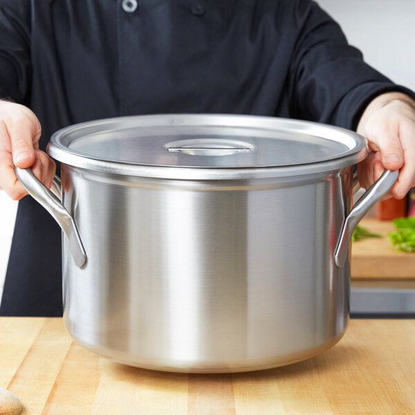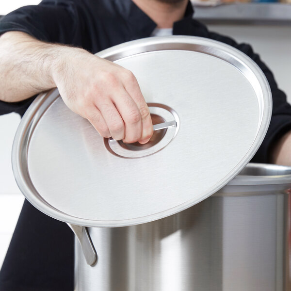 This lid works great with my 10 qt vollrath stock pot. It cleans up easily no matter what sticks or dries on it. It fits well and the handle is easy to grab no matter how fast you're working. I've had mine for a few years now and it still looks great, no warping or staining etc. which is surprising considering the abuse it endures from daily use.