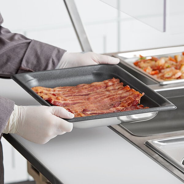 Built from sturdy 300 series stainless steel, the Vollrath 90217 Super Pan 3® stainless steel half size steam table pan features Vollrath's SteelCoat x3 non-stick coating for superior performance! This triple bonded layer interior coating is stain-resistant and boasts a temperature tolerance of -20 to 450 degrees Fahrenheit, which allows you to cook, serve, and display all in the same pan.