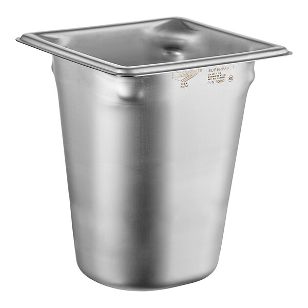 Built from sturdy 22 gauge stainless steel, Vollrath's 90682 Super Pan 3® 1/6 size steam table pan is perfect for any buffet, catered event, or grocery store. This product features an integral frame that is ideal for hot and cold tables at any foodservice operation. Its 1/6 size and 8" depth work well for holding dressings, salad toppings, sauces, and the 300 series stainless steel construction can easily handle daily use. Regardless of the type of business you own, this Vollrath stainless steel steam table pan is a cost-effective product that will last for years to come.