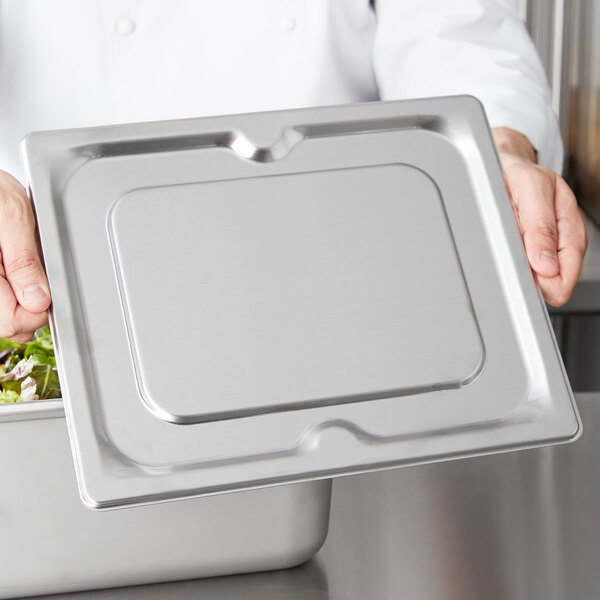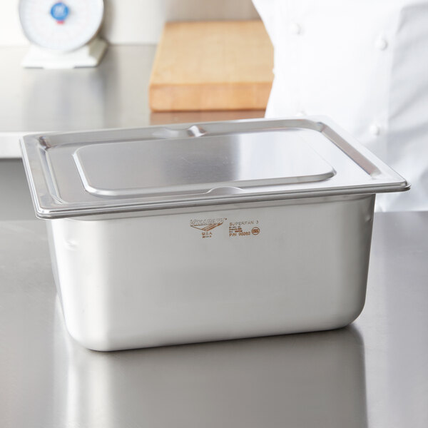 "The Vollrath Super Pan 3 1/2 Size Cook-Chill Cover is a great value cover. It is durable and easy to clean. It fits well on a 1/2 size pan and it doesn't dent or rust easily. The price is great for the quality. I would recommend this."