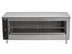 This cheese melter has a 27 1/2" opening that can accept large platters, food pans, or even multiple plates at a time. It's great for plates of appetizers, open faced sandwiches, side dishes, or even warm desserts. Plus, the shelf that holds the plates can be moved up and down among the 5 shelf positions. Adjusting the shelf will help accommodate foods of different heights, or control the heat intensity for hardier or more delicate foods.