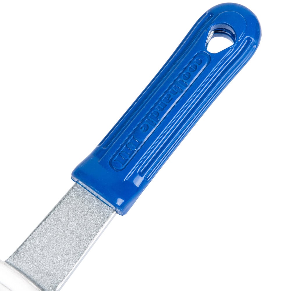 The cool handle is heat-resistant up to 450 degrees Fahrenheit for ultimate safety! The ergonomic handle is molded to your fingers and the blue handle allows for easy color coding to avoid cross contamination.