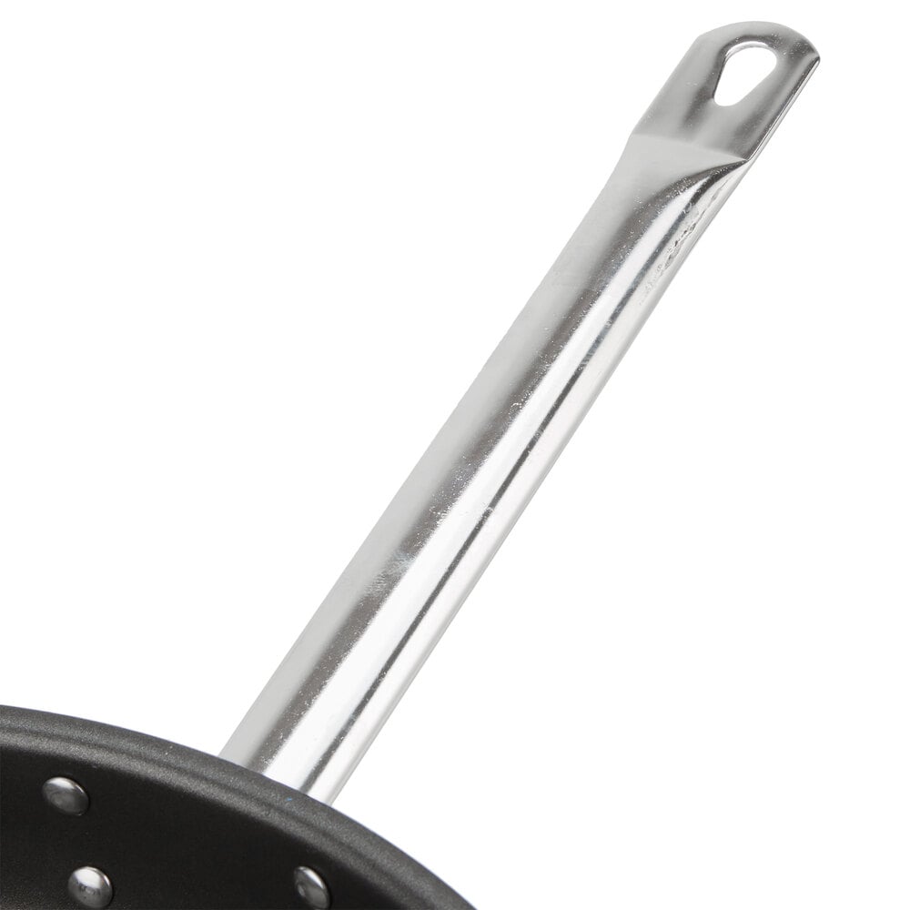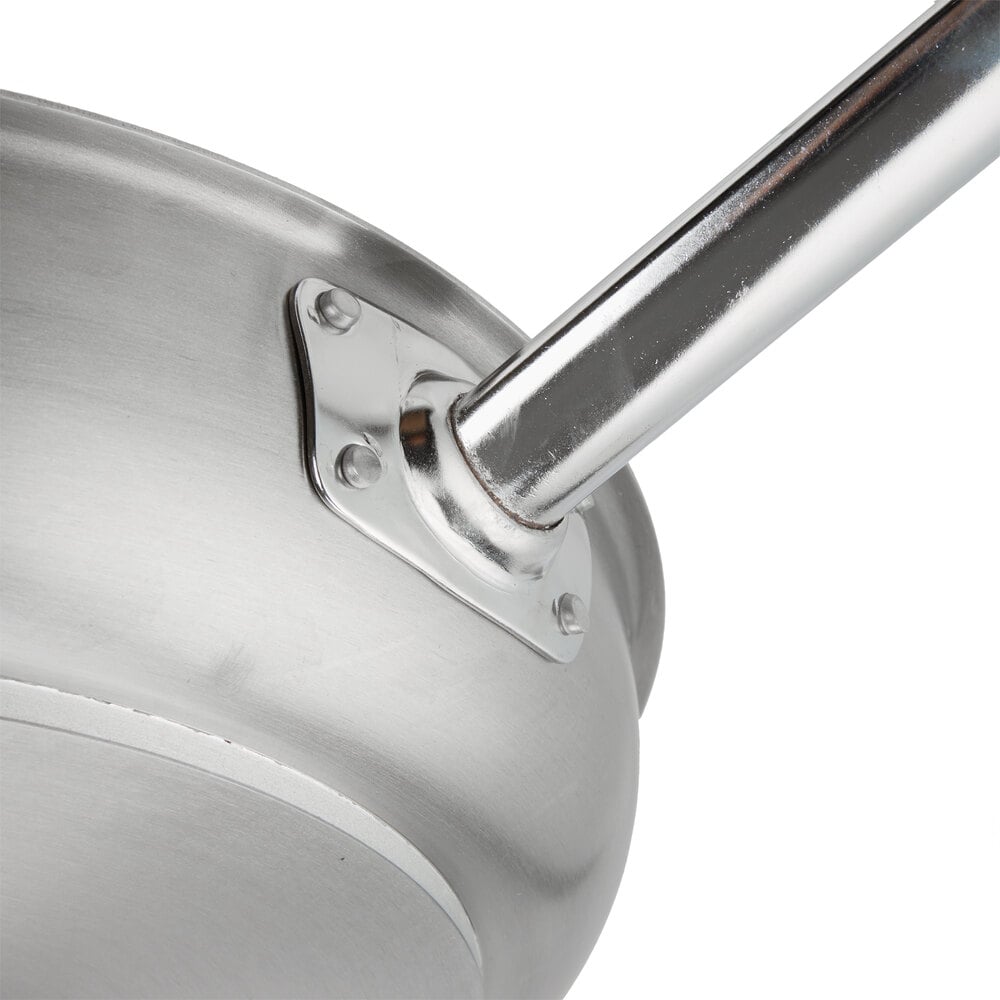 The riveted-on handle ensures longevity and provides a very rigid connection between handle and vessel for a long-lasting addition to your cooking equipment.