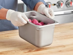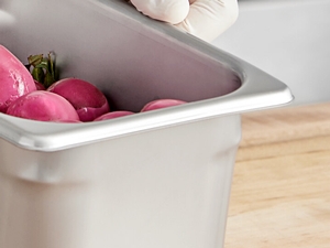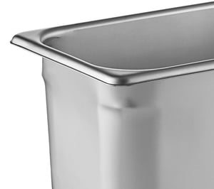 This steam table pan features reinforced corners that add strength where the pan takes the most abuse. The corners ensure the pan fits tightly in food wells, maximizing temperature retention for improved food quality and, most importantly, food safety. They also make the pan easier to carry and increase its resistance to breakage or warping.