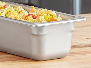 This steam table pan features reinforced corners that add strength where the pan takes the most abuse. The corners ensure the pan fits tightly in food wells, maximizing temperature retention for improved food quality and, most importantly, food safety. They also make the pan easier to carry and increase its resistance to breakage or warping.