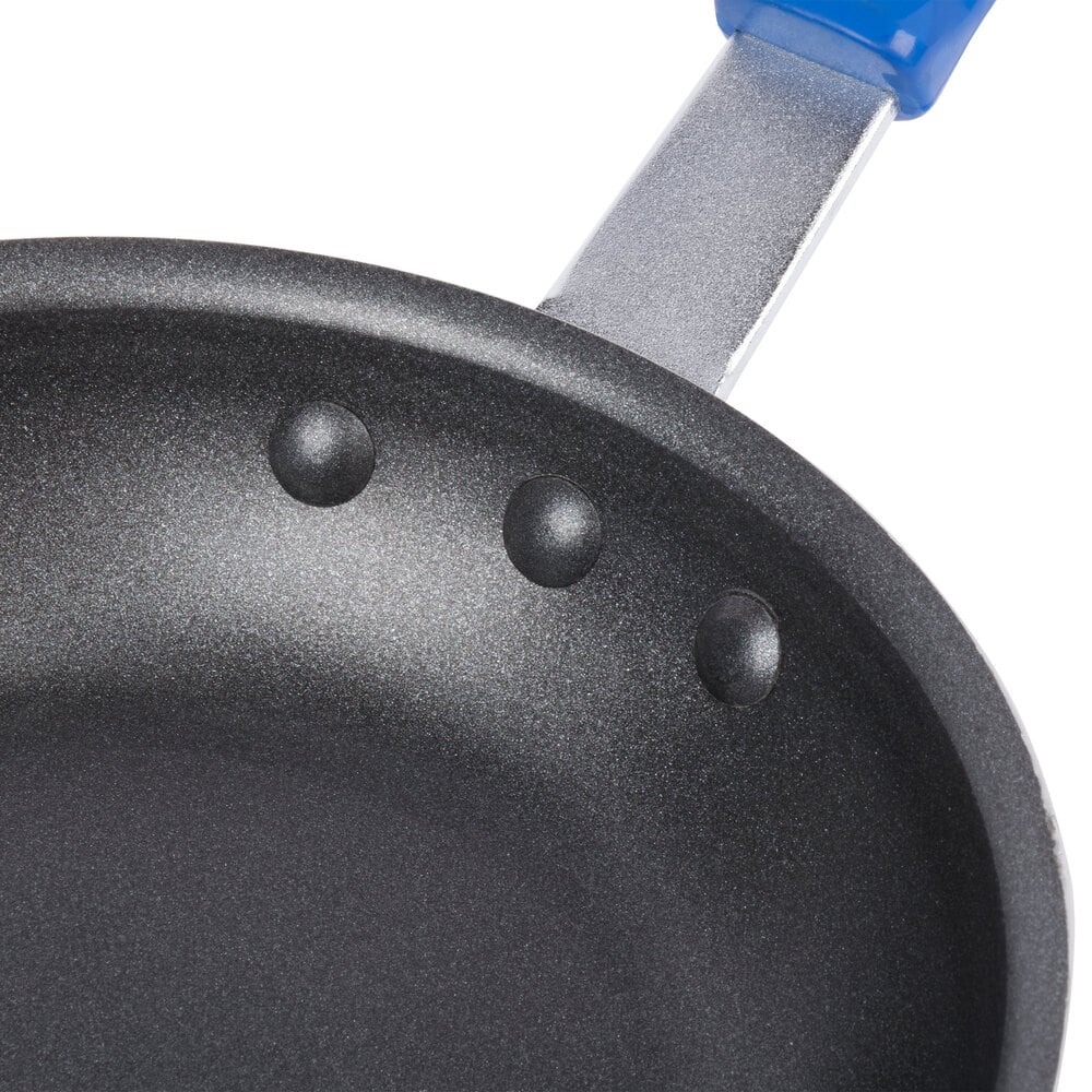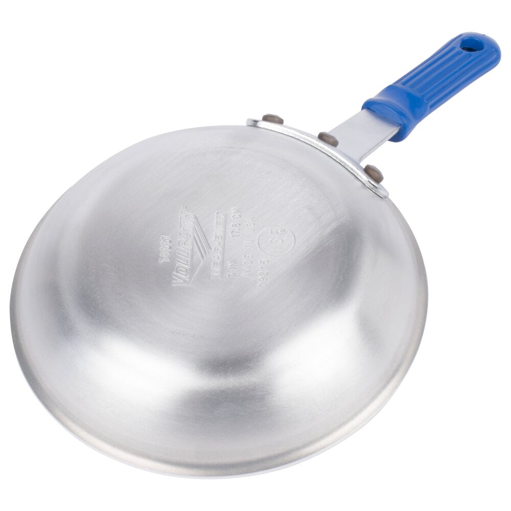 Ideal for cooking low acidic foods such as mushrooms, broccoli, and cauliflower, this Vollrath T4007 Wear-Ever 7" aluminum fry pan with blue cool handle features Vollrath's innovative SteelCoat x3 non-stick coating for longer life, superior durability, and advanced release. With an easily replaceable cool handle and secure EverTite rivets, this pan is both long-lasting and resilient.