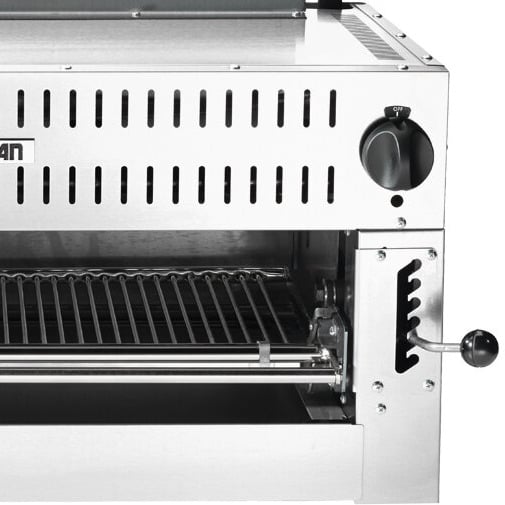 Equipped with one ceramic infrared burner, this salamander delivers 30,000 BTU per hour to keep up with high demand orders in a commercial environment. This unit features dual heat controls for zone cooking and improved temperature control ranging from 250-800 degrees Fahrenheit.
