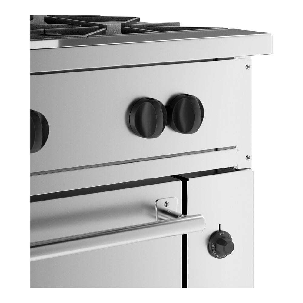 This heavy-duty, versatile piece of cooking equipment is perfect for those tight spaces where you need one piece of equipment to do multiple tasks. Since this unit features 6 open top burners with a standard oven base, you can fry and simmer on top while eliminating wasted space by using the oven below for your baking and warming needs. For quick ignition, the unit comes with a shrouded flash tube pilot system per two burners. A liquid propane connection is required for operation.