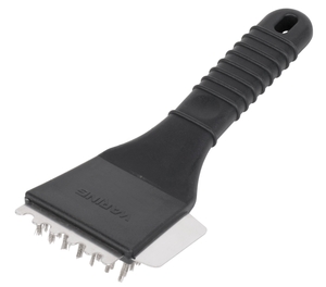 This scraper features durable stainless steel blades and strong bristles to scrape grease and other build-up off of your grill surface.