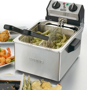 Deep fry everything from french fries and onion rings to seafood and chicken with this Waring commercial countertop deep fryer! Featuring a hinged heating element, removable stainless steel tank, twin steel wire baskets, and a built-in 30 minute timer, it is a must-have for any commercial kitchen. This unit requires a 120V electrical connection to operate.