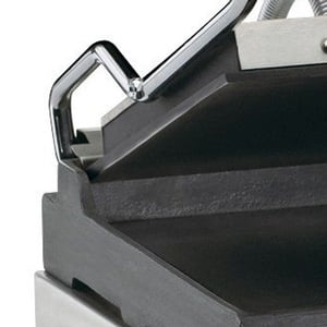 The Waring WFG150 panini grill features a brushed stainless steel body, which adds needed durability for commercial kitchen environments. Its build also ensures easier cleanup and maintenance.