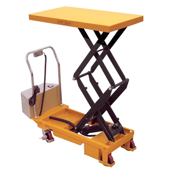 This Wesco Industrial Products 273713 20" x 36" powered lift scissors table is the perfect way to move heavy objects safely and easily, without risk of strain or injury to your employees! This table has a weight capacity of 770 lb. and uses a push-button height control mechanism to make raising and lowering the table easy. For added convenience, the control box is removable for handheld operation. The 20" x 36" product table adjusts from 14" - 51" high, on a powered scissors-style lift. And to make moving objects easy, it comes with a handle and a set of (4) 5" polyurethane casters, (2) rigid and (2) swivel, with brakes that let you keep the table stationary when needed.