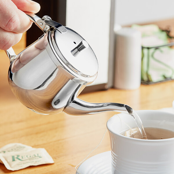 This Winco 10 oz. stainless steel gooseneck teapot is a great addition to table tea service in cafes or fine dining bistros. Its sleek, classic welded gooseneck spout adds a stylish flair when pouring cups of tea, and the hollow handle with vented lid provides convenient use. Capable of holding up to 10 oz. of hot tea, this teapot is perfect for serving single portions, allowing guests to enjoy their cups of tea exactly how they like it, whether it be strong, weak, or somewhere in between.