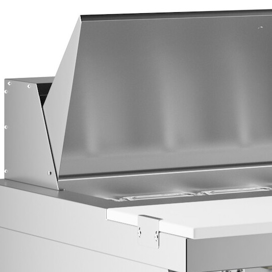 Its top accommodates up to (10) 1/6 size food pans up to 6" deep (included). These are great for holding common sandwich or salad toppings, from eggs and cheese to green pepper or ham. Plus, a lift-up lid encloses the top to maintain safe temperatures. The food pans are recessed into the table for better food temperature holding.