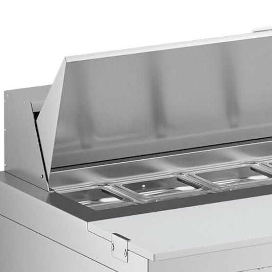 Its top accommodates up to (12) 1/6 size food pans up to 6" deep (included). These are great for holding common sandwich or salad toppings, from eggs and cheese to green pepper or ham. Plus, a lift-up lid encloses the top to maintain safe temperatures. The food pans are recessed into the table for better food temperature holding.