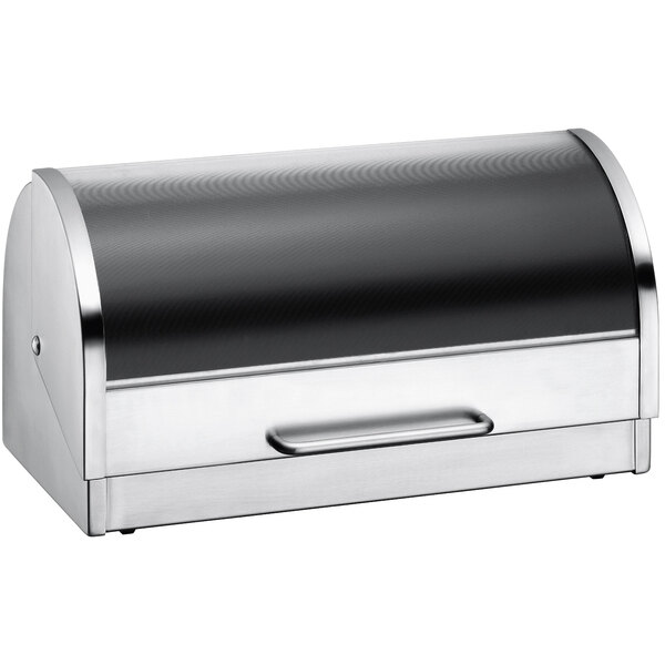 Modernize your self-service station with this WMF from BauscherHepp 06.3441.6030 15 3/8" x 8 1/8" stainless steel roll-top display bread box with glass cover. Featuring a stainless steel construction with a mirror polished finish, this attractive bread box offers durability and a distinctly modern look to your guest service. Use it at self-service areas like breakfast bars and buffets to keep fresh-baked breads, bagels, danishes, and muffins fresher for longer and protected from contaminants.