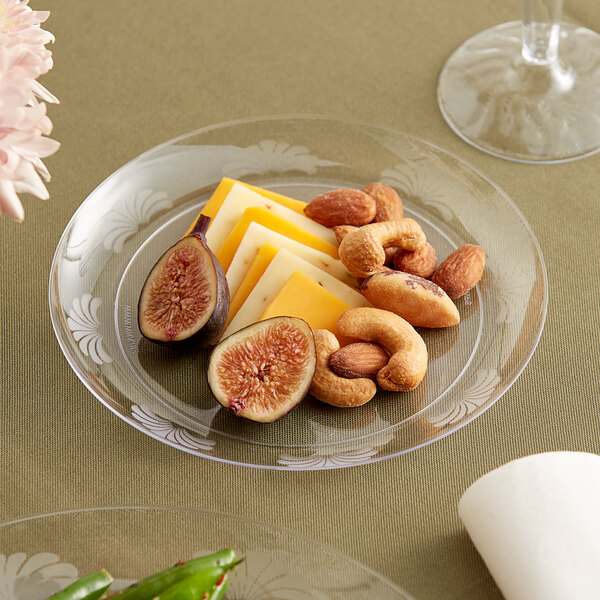 Featuring WNA Comet Designerware's etched, elegant detailing around the rim, this plastic plate is the perfect addition to special events and gatherings. While its 6" surface area makes it great for serving appetizers and desserts, its tapered rim helps contain sauces and dressings to prevent accidental messes. Plus, it's disposable to ensure easy clean up once your guests have finished.