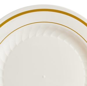 Allow the attractive, gold colored accent bands and delicate fluting of this plate elevate your meal service to new heights. Providing the look of china with the convenience of plastic, this elegant piece is sure to enhance your food presentation at your next celebration, banquet, or other catered event. It's disposable to eliminate time wasted washing dishes, and has none of the related storage and transport costs of real china. Plus, the attractive appearance makes it ideal for elegant dining environments where real china simply isn't feasible or desired!