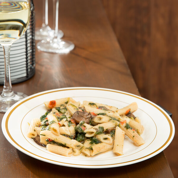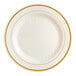 Allow the attractive, gold colored accent bands and delicate fluting of this plate elevate your meal service to new heights. Providing the look of china with the convenience of plastic, this elegant piece is sure to enhance your food presentation at your next celebration, banquet, or other catered event. It's disposable to eliminate time wasted washing dishes, and has none of the related storage and transport costs of real china. Plus, the attractive appearance makes it ideal for elegant dining environments where real china simply isn't feasible or desired!