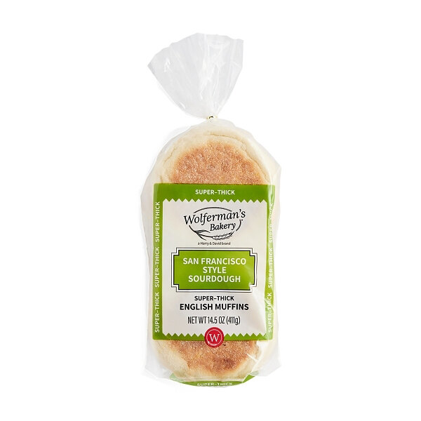 Serve a satisfying breakfast staple without sacrificing quality using these Wolferman's Bakery San Francisco-style sourdough super-thick english muffins! Made with a time-tested sourdough starter that's over 100 years old, these english muffins offer a distinctive sourdough flavor with a tangy taste and aroma that's unique to sourdough bread. Their fresh-baked taste and classic, soft and chewy texture creates a beloved bread with a unique sourdough twist. These english muffins are crafted with care and are fully baked - they're ready to eat as is or can be served toasted to suit your customers' preferences! Plus, they're thicker than traditional english muffins, offering twice the thickness for a more substantial breakfast option. Their pillowy texture and fresh taste make these english muffins a delightful choice for your breakfast buffet or restaurant.