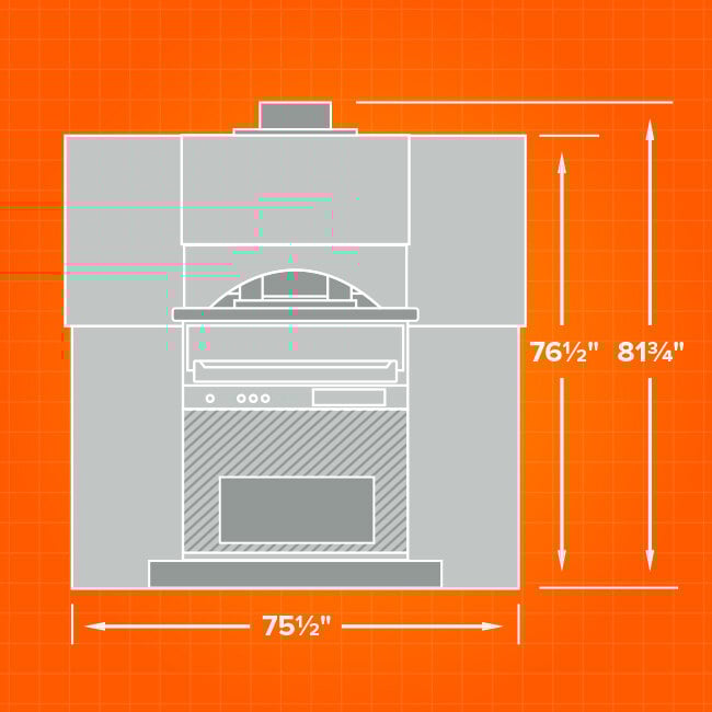 The cooking surface is 57" in diameter and the door opening measures 29 1/2" x 7 3/4" for easy loading and unloading. This OneRev oven comes standard with a stainless steel debris management mantel, and the insulated walls require a 1" side clearance to combustibles.