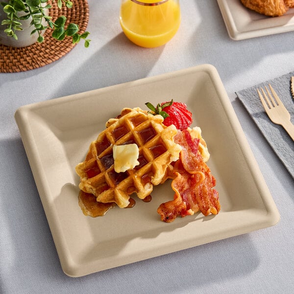 Serve your menu favorites while helping the environment with this World Centric 10" compostable square fiber plate! Crafted from unbleached plant fiber, this plate is an eco-friendly alternative to traditional paper or plastic options. Perfect for serving entrees and main courses, this square plate elevates the appearance of your meal presentations and is disposable for added convenience. Additionally, this plate is compostable in commercial facilities, though one may not be available in your area, so be sure to check beforehand.