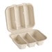 Serve your menu favorites and help the environment too with this World Centric 3-compartment compostable fiber clamshell taco container 8" x 7" x 3". This container is perfect for takeout service of your signature tacos, small sides, and desserts. It is able to contain both hot and cold foods for ultimate convenience, and its 3 compartments allow it to hold a variety of foods at once without flavors mixing. Its easy-to-use clamshell lid securely shuts to keep the contents fresh and prevent spills during transport.