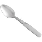 Add style and flair to your table settings with this World Tableware 322 002 Collingwood 7 1/2" 18/0 stainless steel heavy weight dessert spoon. Featuring decorative handles with elegant, twisting lines, the Collingwood collection offers an intriguing look that your guests are bound to appreciate. This item also boasts a dependable stainless steel construction for increased longevity. Its satin finish even conceals fingerprints from sight while adding luster to front-of-house displays!