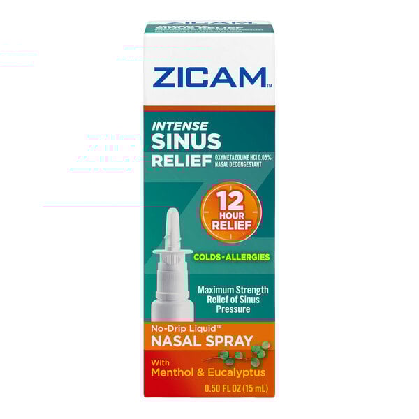 Keep your medicine cabinet or first aid kit stocked with this Zicam intense sinus relief nasal spray! This nasal spray contains powerful oxymetazoline to temporarily relieve nasal congestion and sinus pressure. It contains menthol and eucalyptus for a cooling sensation.